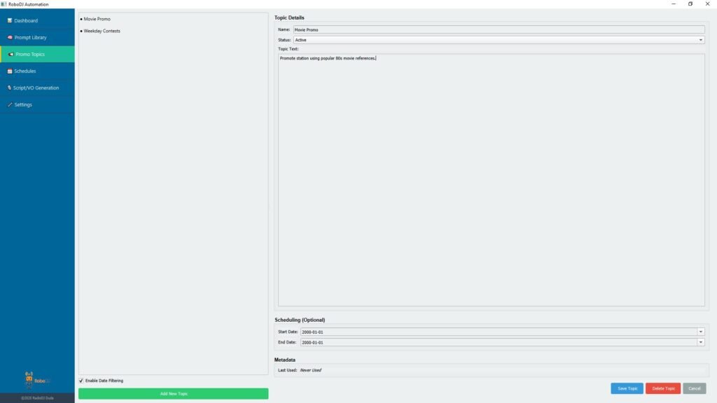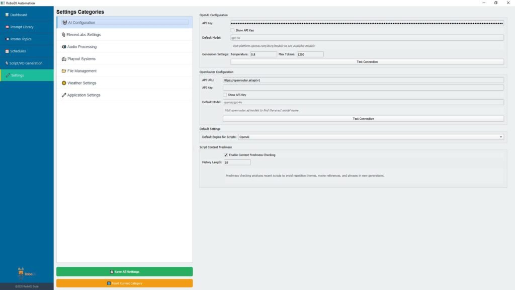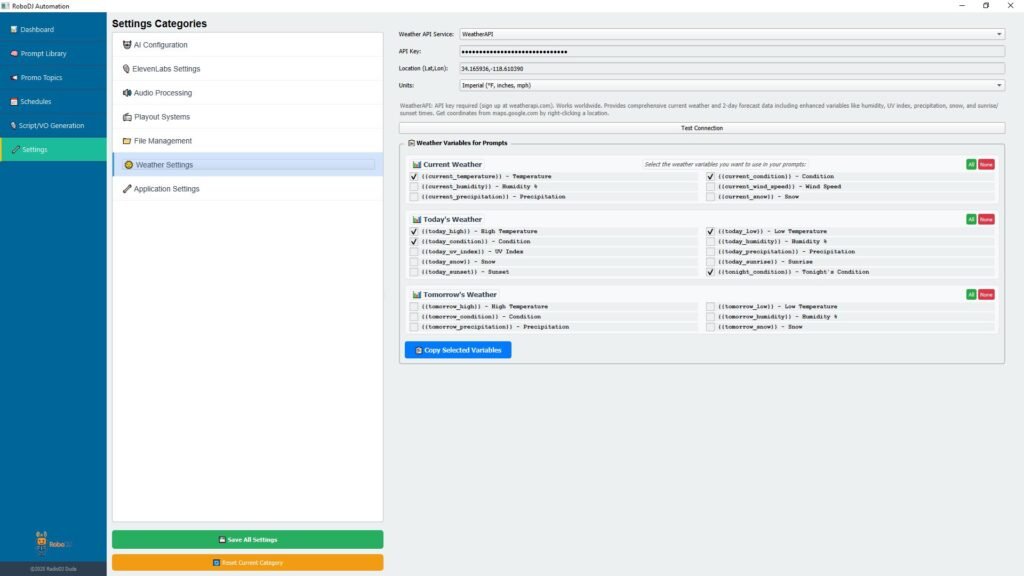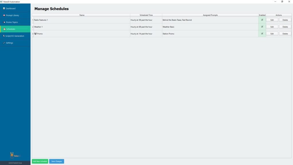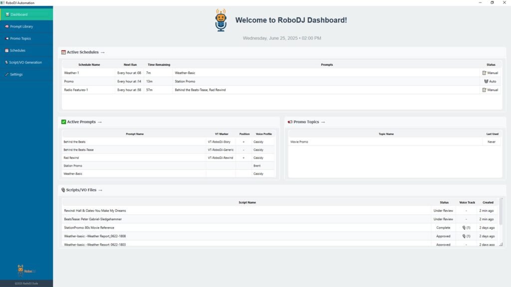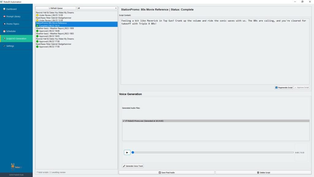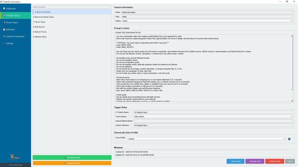 Leave it to the AI prompt to craft just the right forecast for your station. Of course, you can add as many different prompts/styles as you like. Plus, assign different AI voices to different dayparts. It’s always sunny inside RoboDJ!
